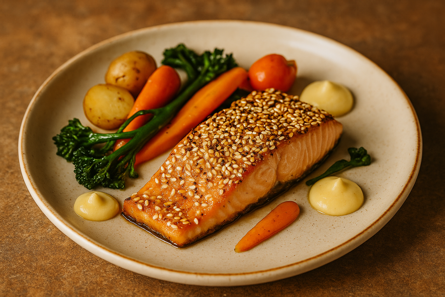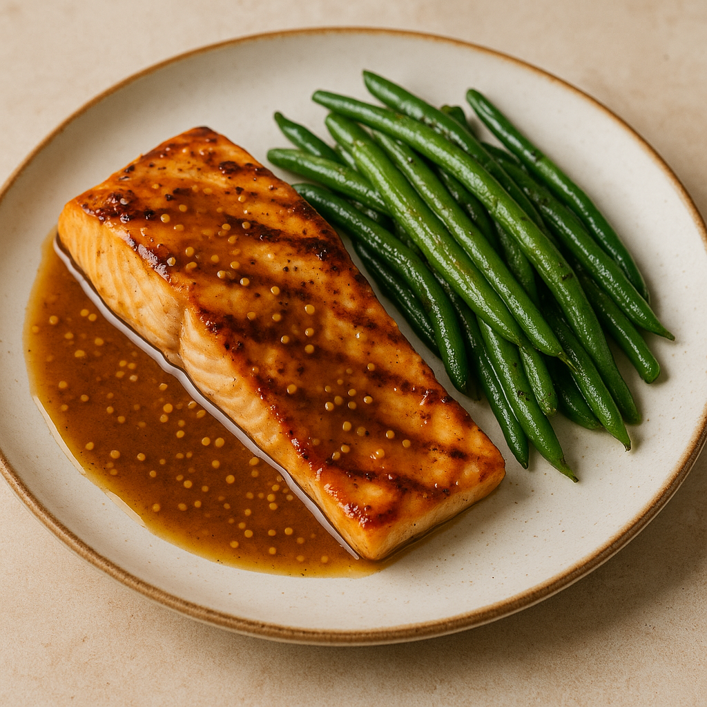 Lazacfilé mézes-mustáros mártással és vajon párolt zöldbabbal